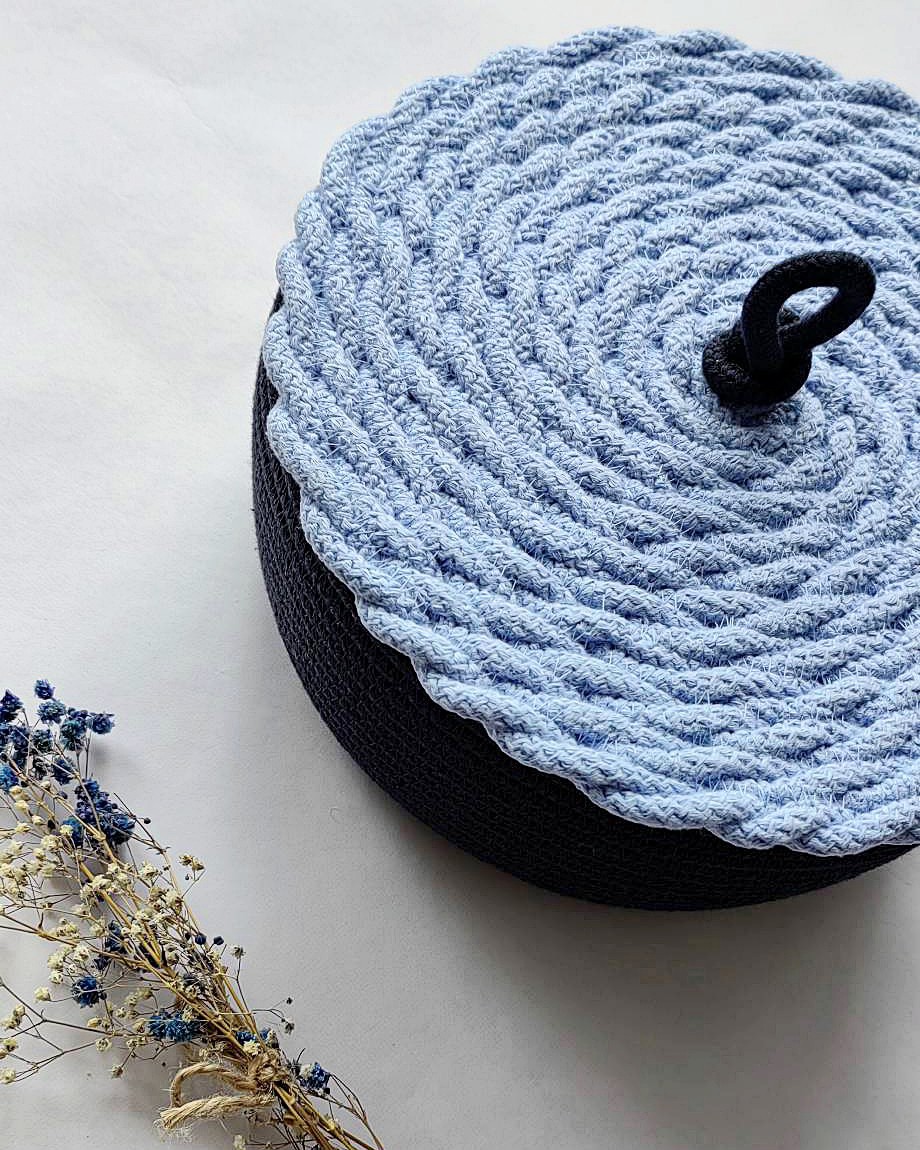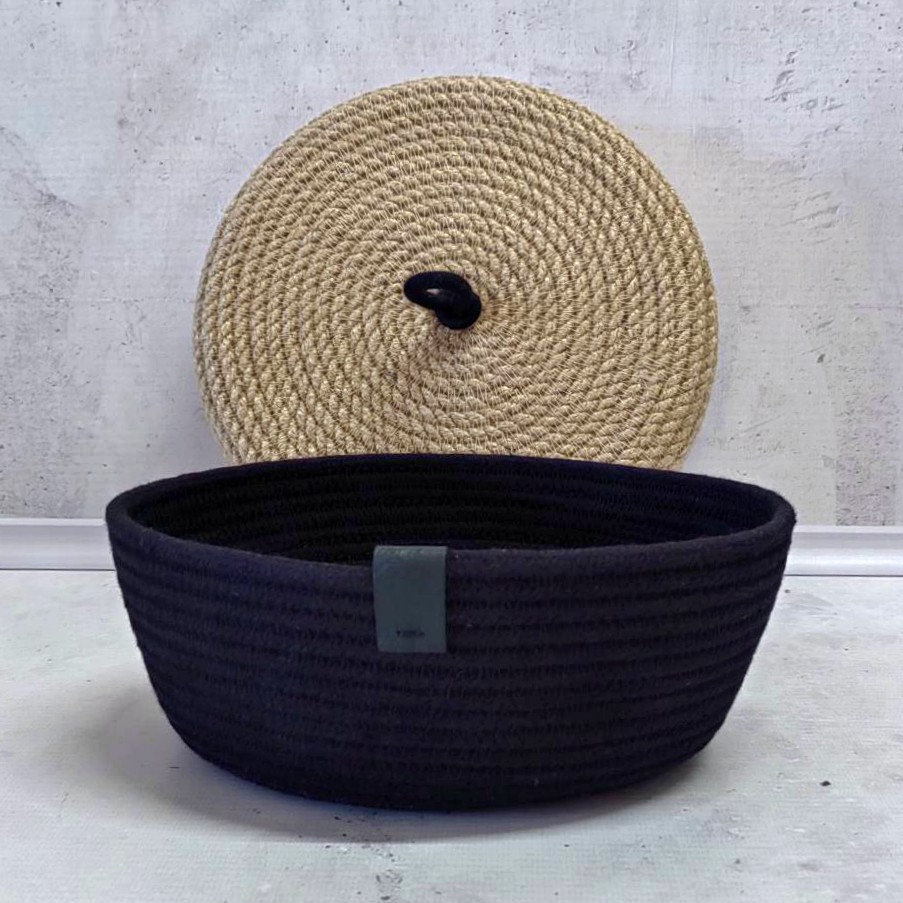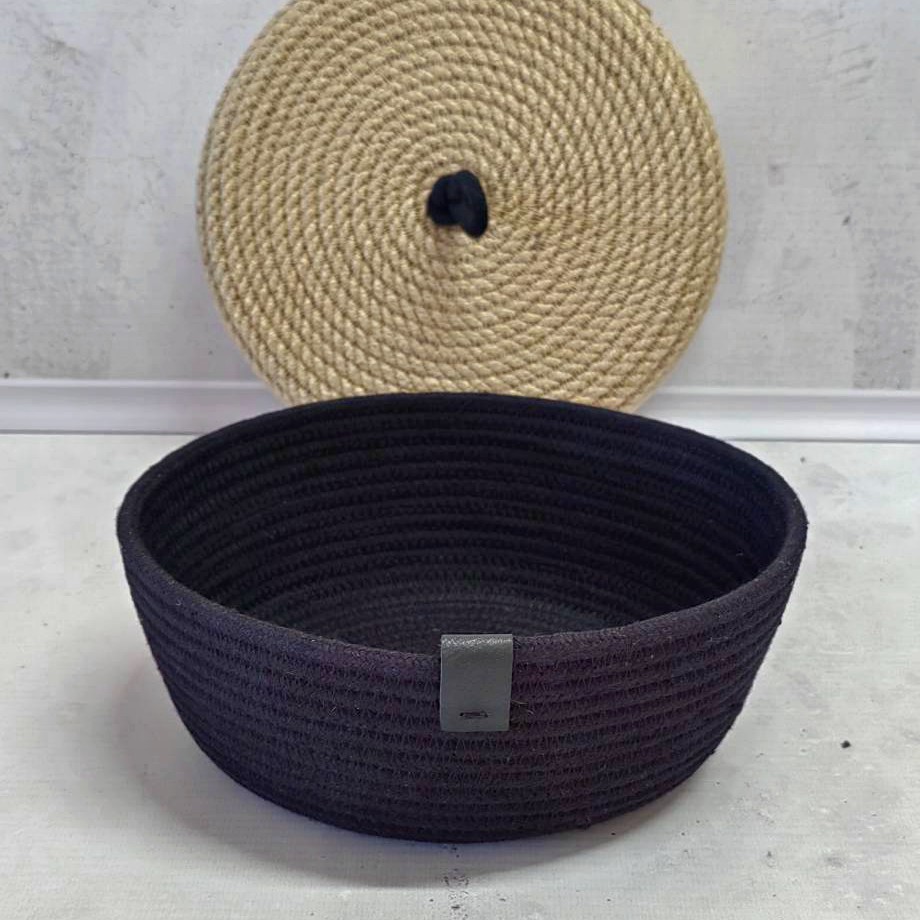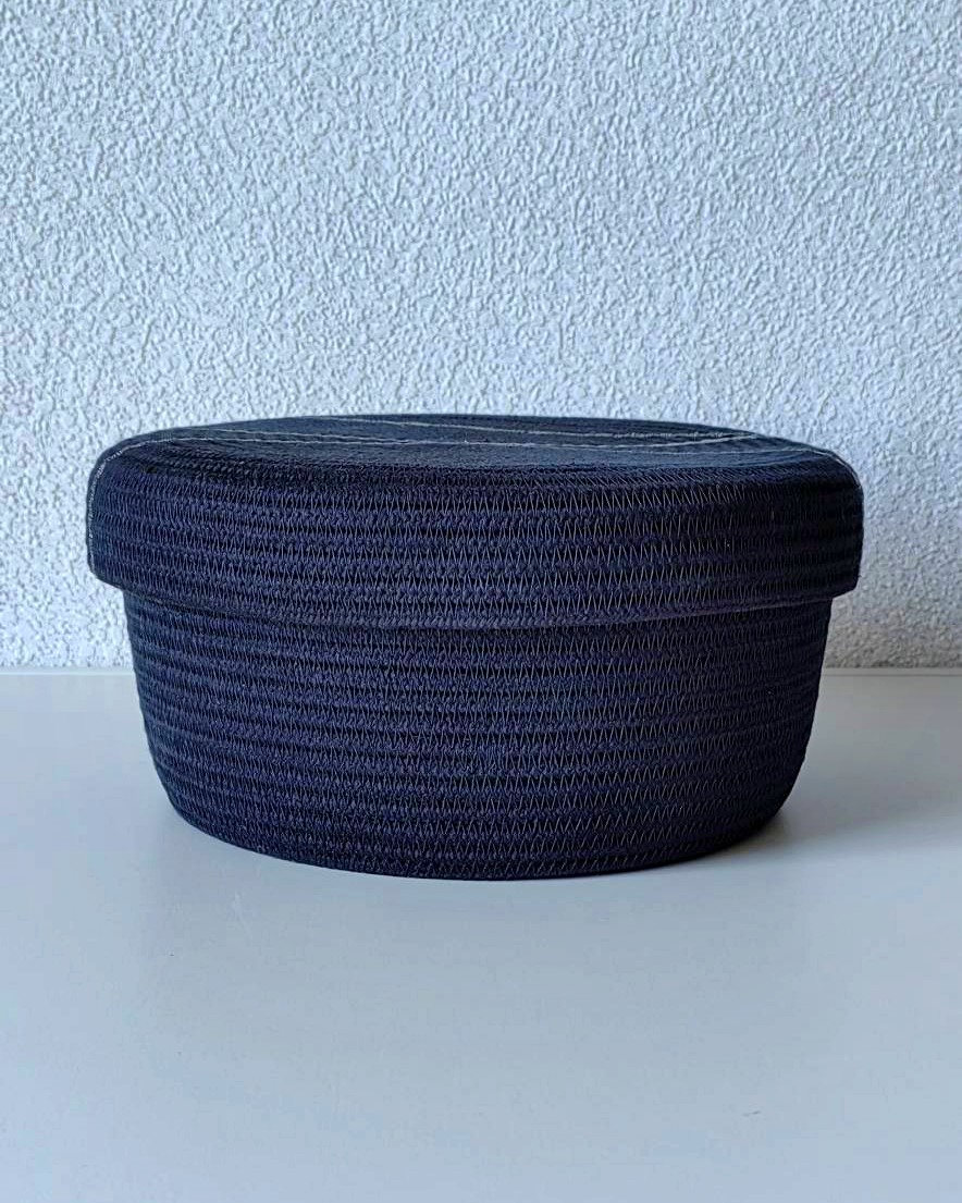 Небольшая черная корзинка с крышкой меланжевого оттенка из хлопкового шнура.