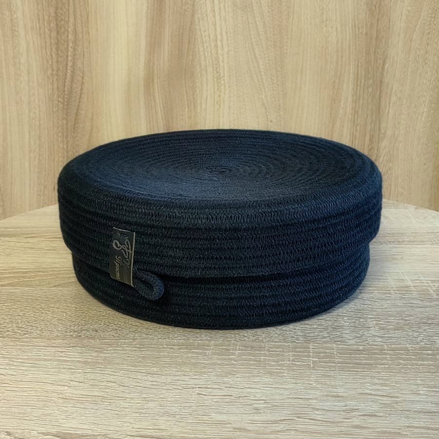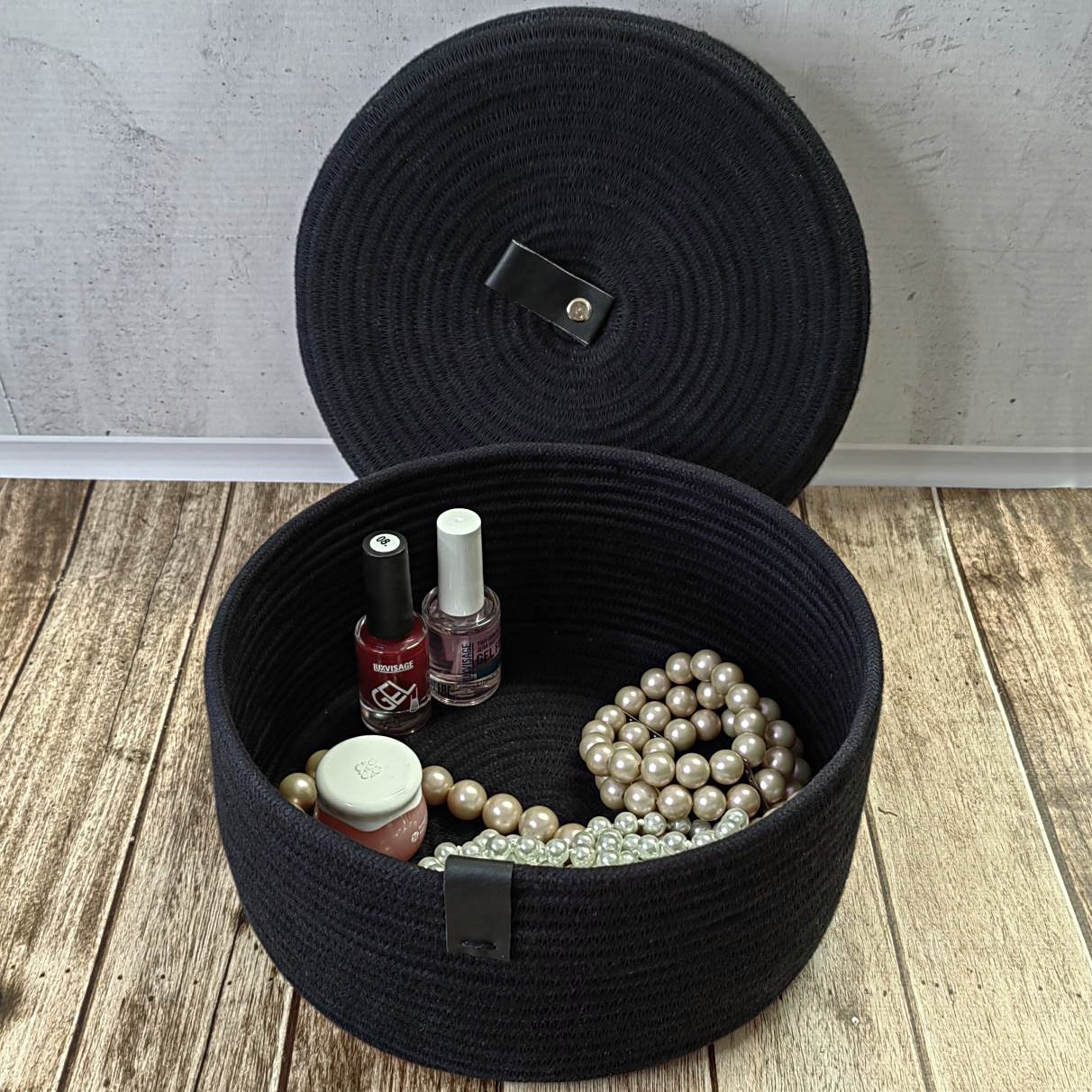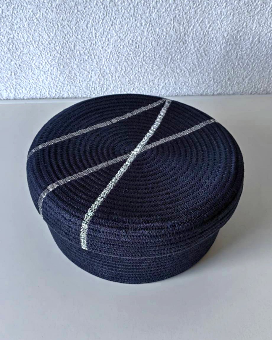 Небольшая черная корзинка с крышкой меланжевого оттенка из хлопкового шнура.