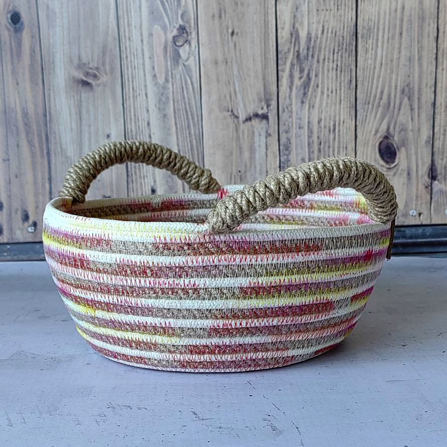 Изюминка этой корзины – пестренький кант и манящие ручки с бахромой.