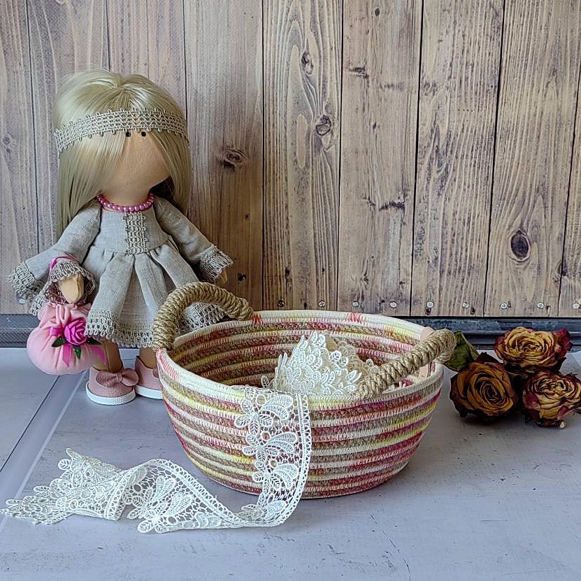 Изготовлена корзина в натуральном оттенке «ваниль», а кант и ручки из пастельных «ассорти цветов».
