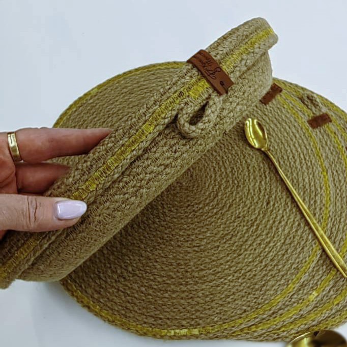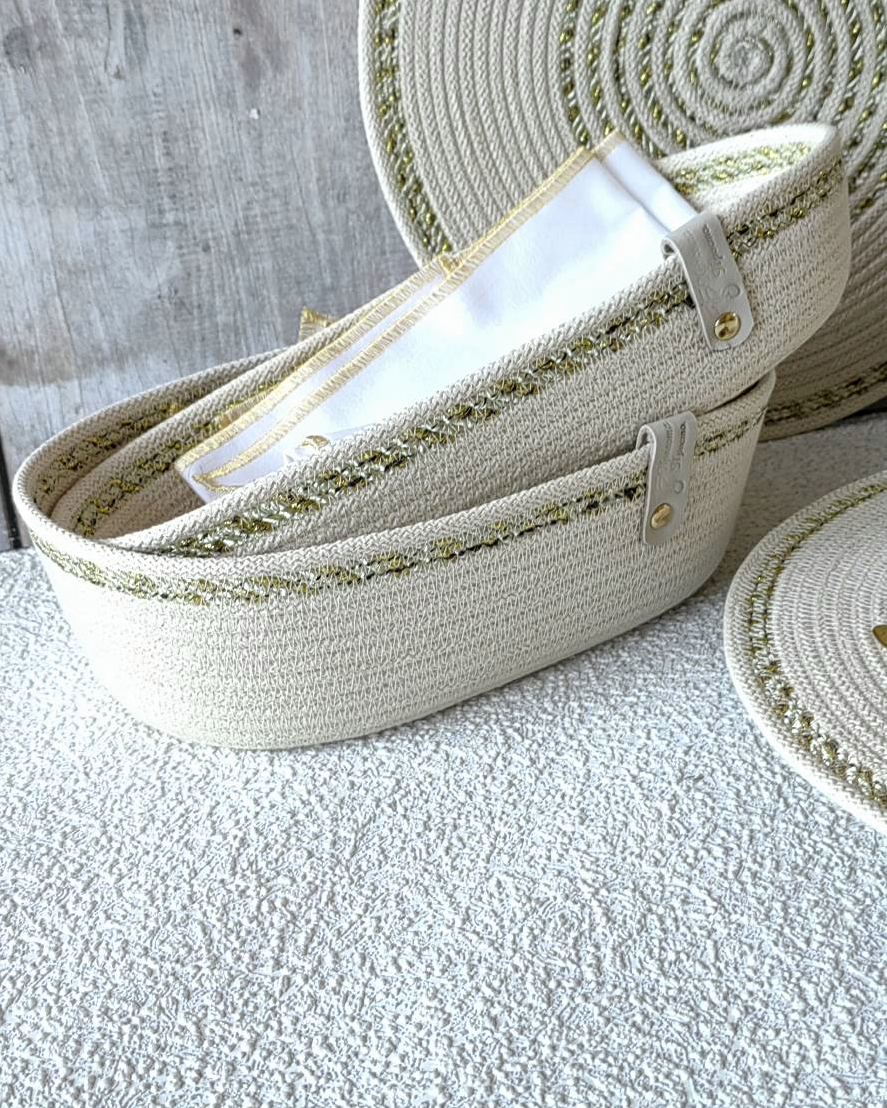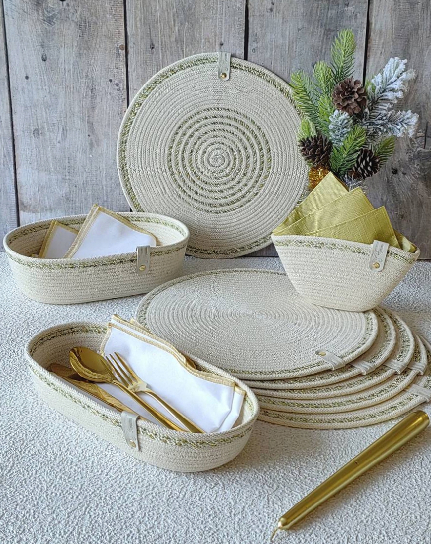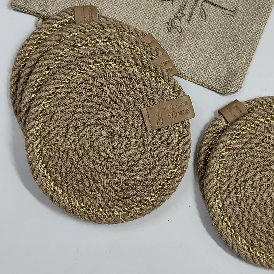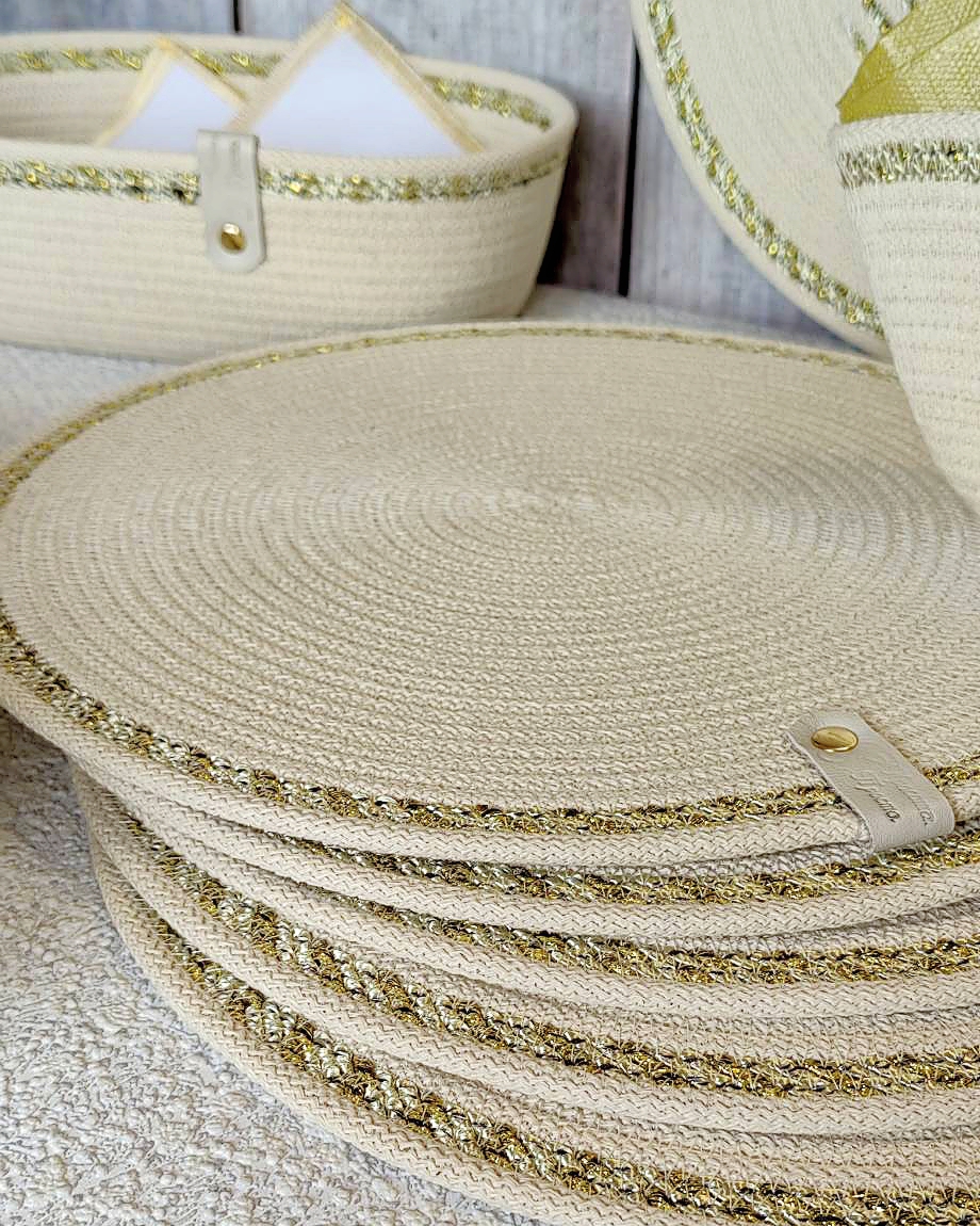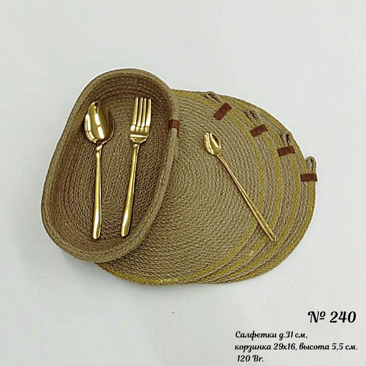 Чудесный джутовый комплект c золотой отделкой.