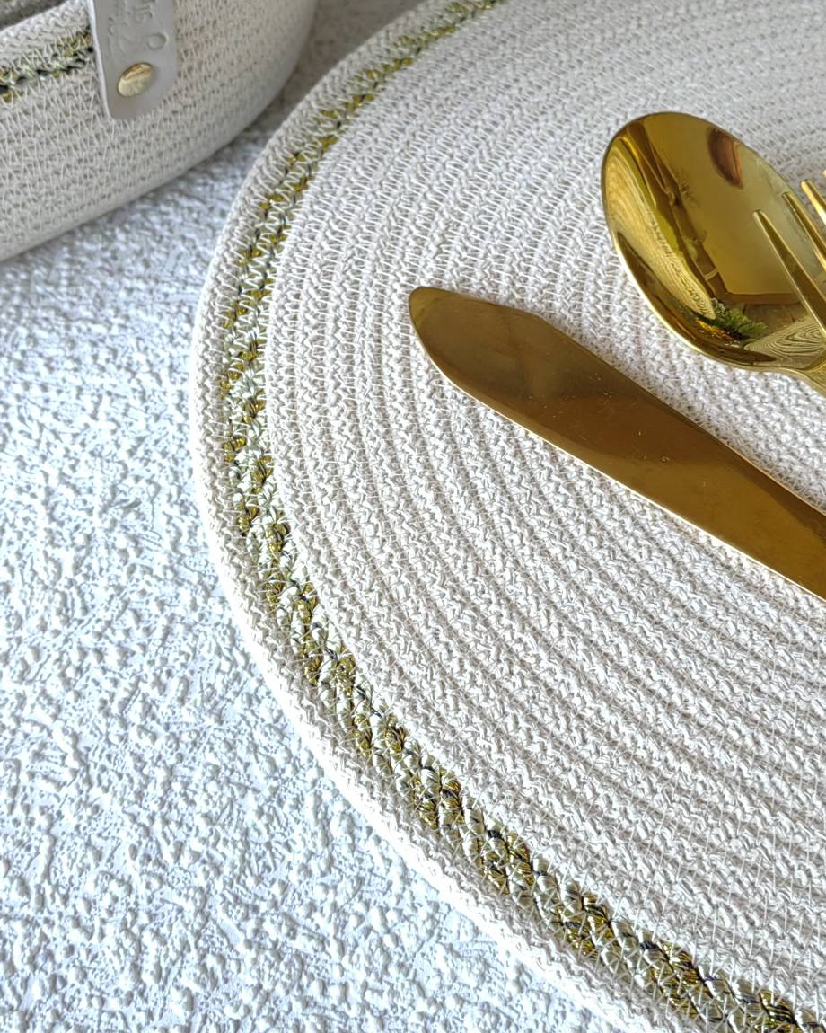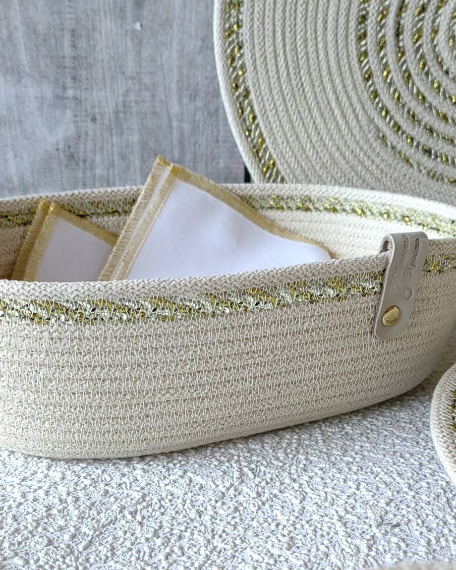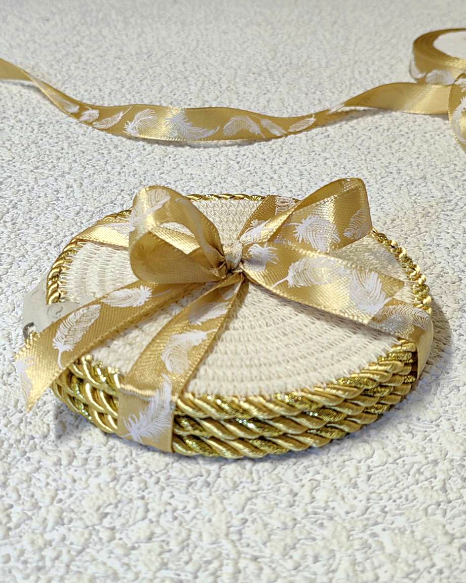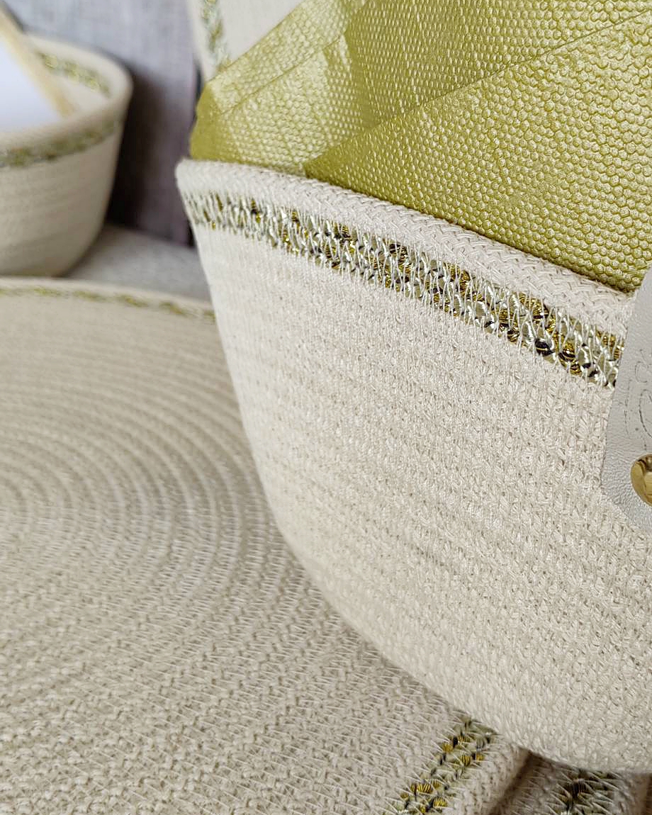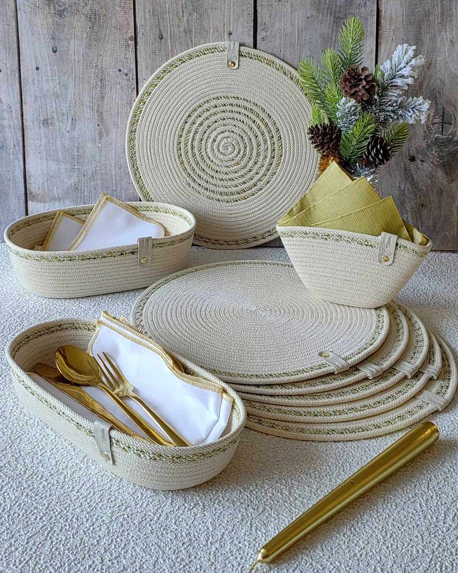 Чудесный джутовый комплект c золотой отделкой.