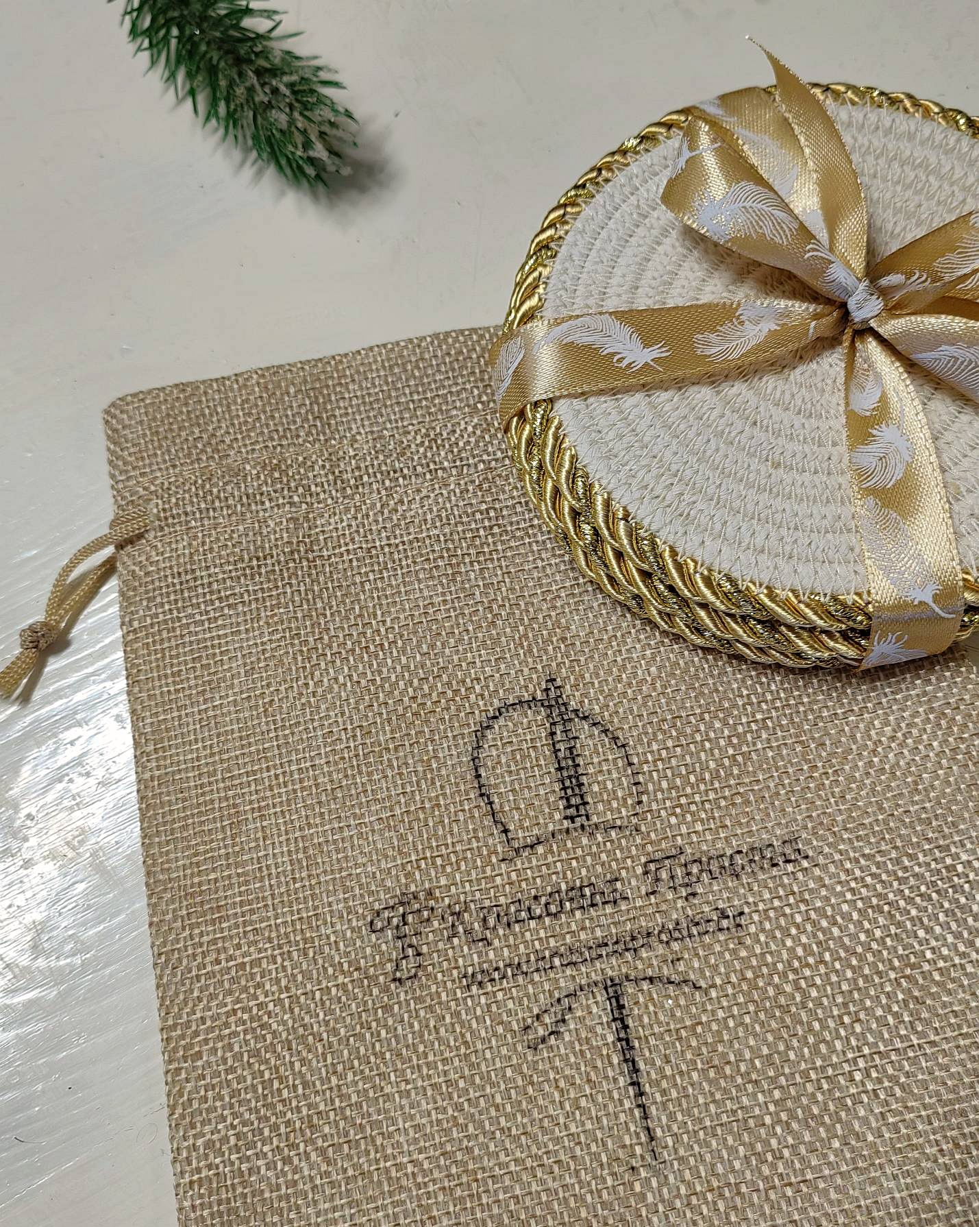 наборчик из трех праздничных подставочек под бокалы, чашки в брендовом мешочке