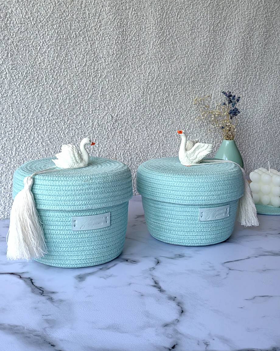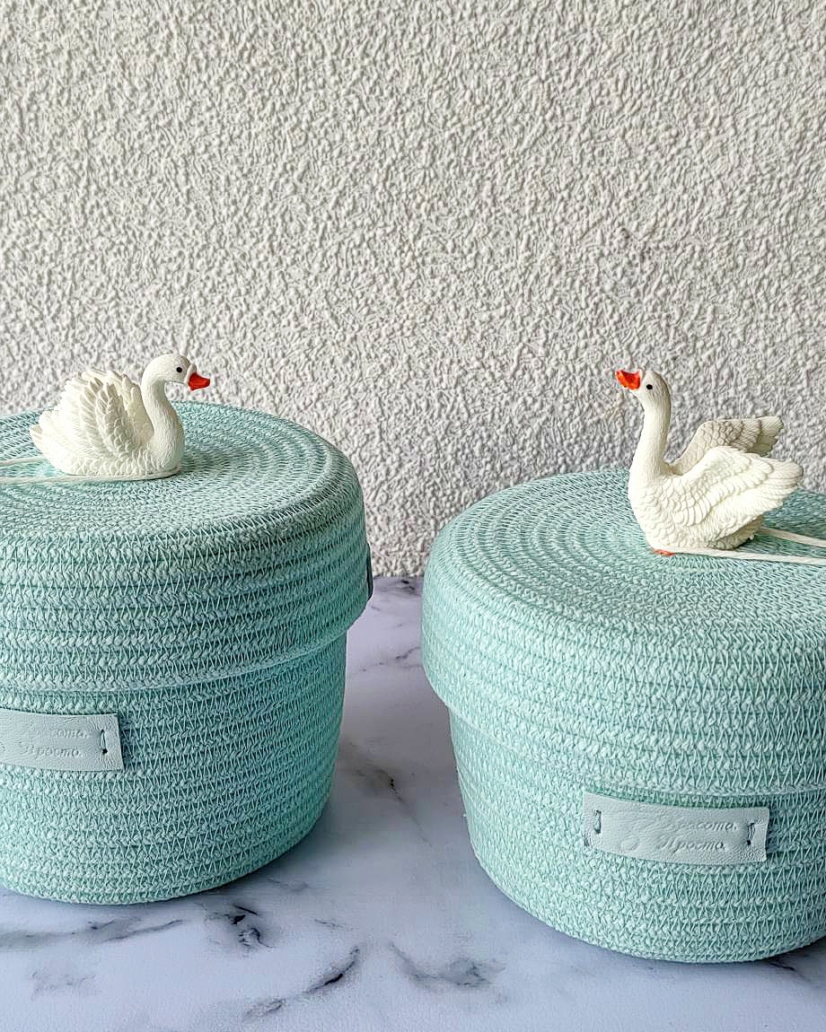 Представьте: пара нежных мятных корзинок, украшенных изящными лебедями на крышечках, словно символ вечной любви, готовых оберегать ваши сокровища.
